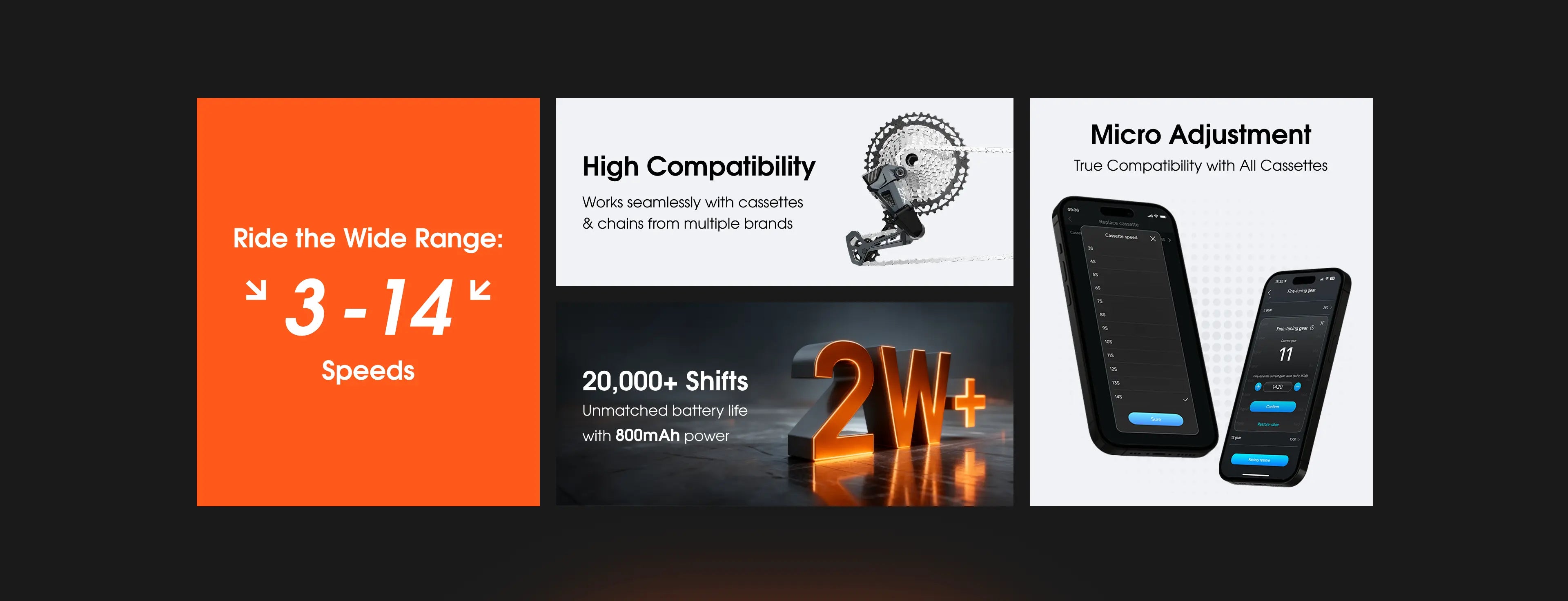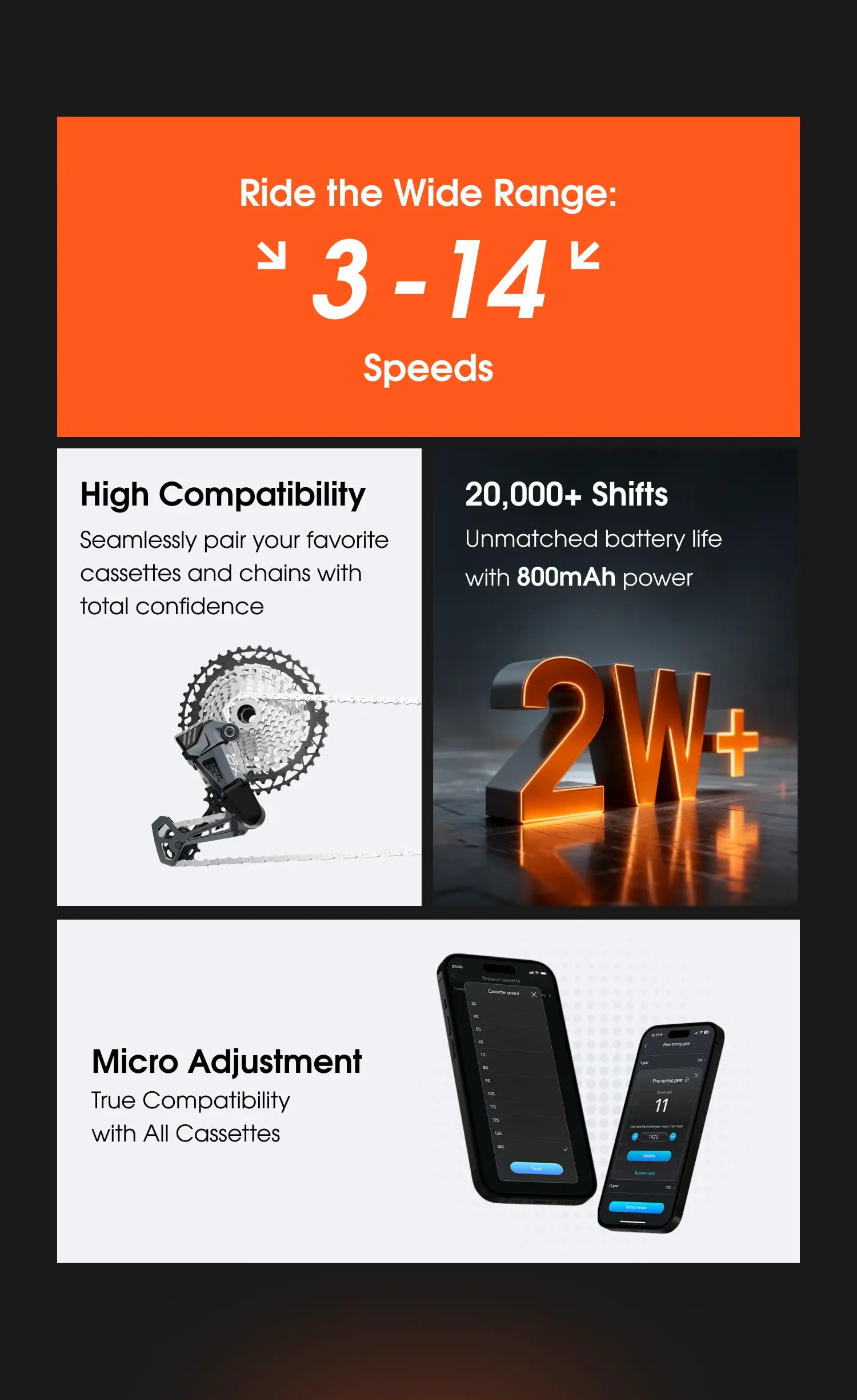 "Eliminate cable issues with WHEELTOP's wireless shifting system. Experience silent, instant gear changes with Swiss-watch precision through Bluetooth and ANT+ connectivity. The system offers customizable 3-to-14-speed configurations via app, with manual fine-tuning also available for complete control."