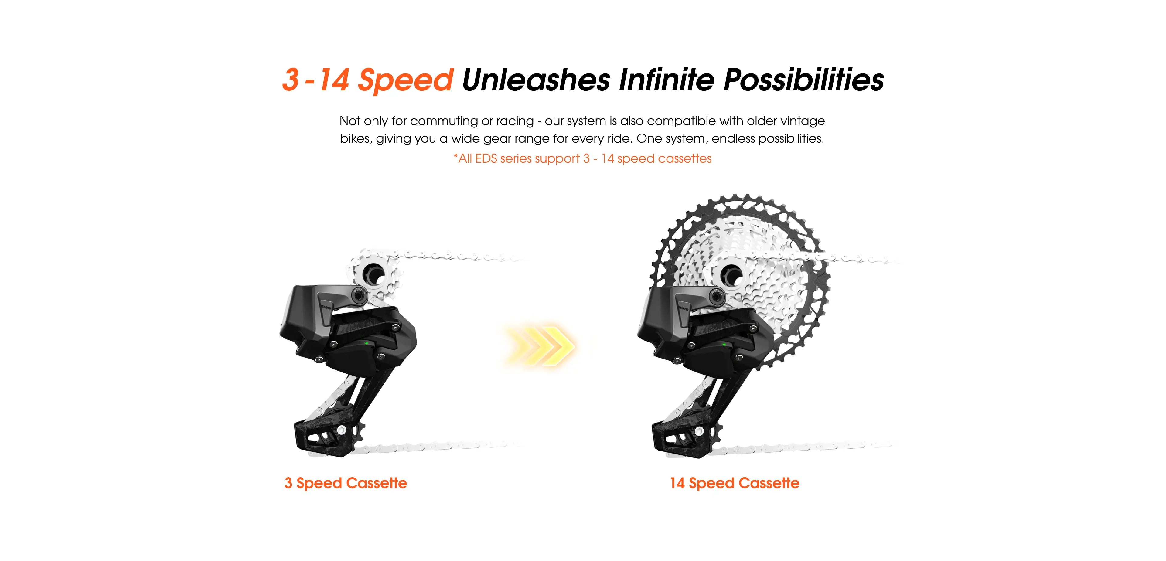 "Wheeltop Wireless EDS TX 3-14 Speed Groupset: “Compared to a mechanical derailleur, the Wheeltop Electronic Derailleur allows you to switch speeds easily.” The system provides compatibility for any cassette, from 3 speed to 14 speed. All of this is accomplished inside the Wheeltop App."
