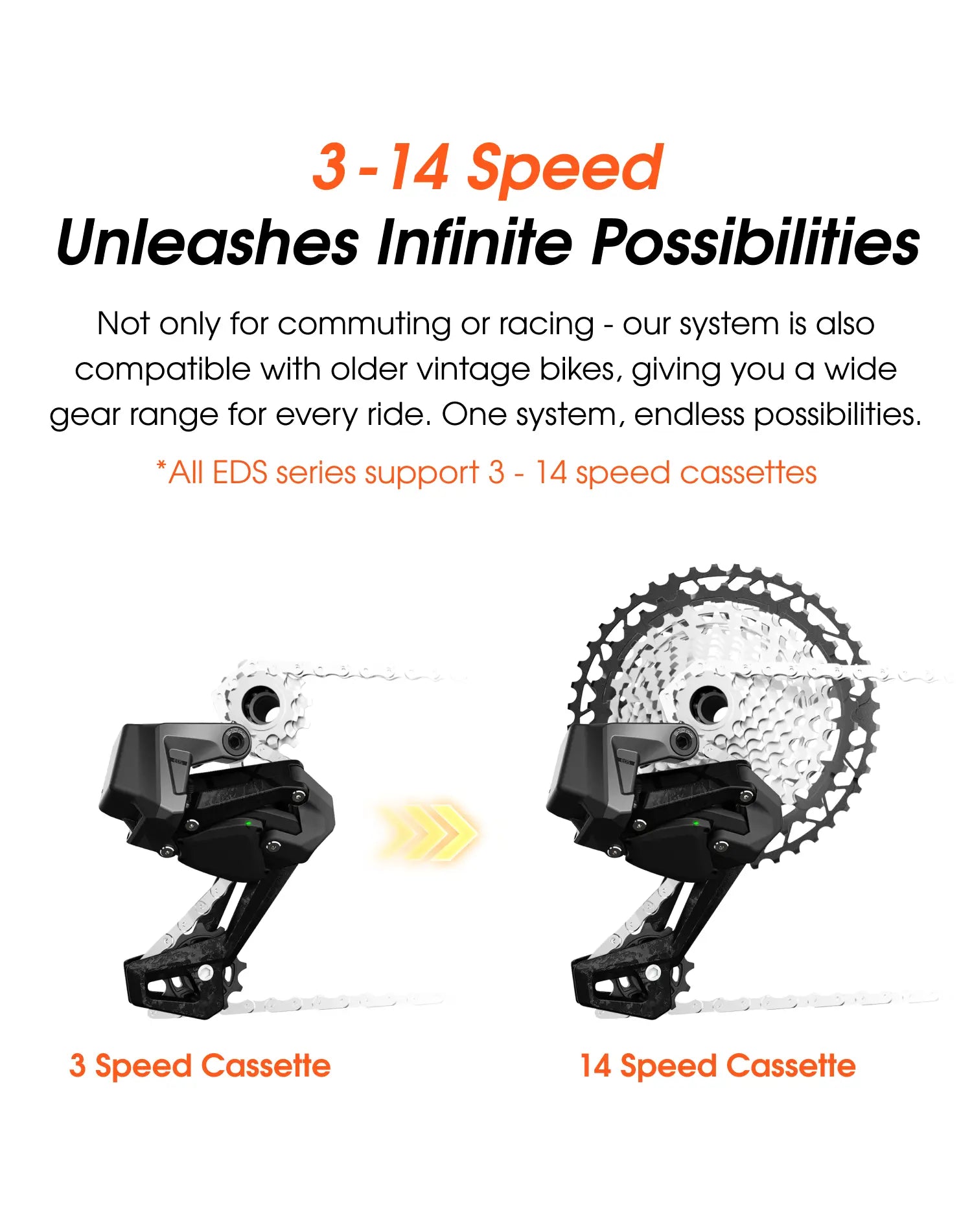 Experience the future of cycling with our fully wireless electronic derailleur, offering customizable 3-14 speeds for the smoothest gear shifting. Embrace the freedom to create your perfect journey with the WHEELTOP Electronic Derailleur System (EDS) - your adventure awaits!