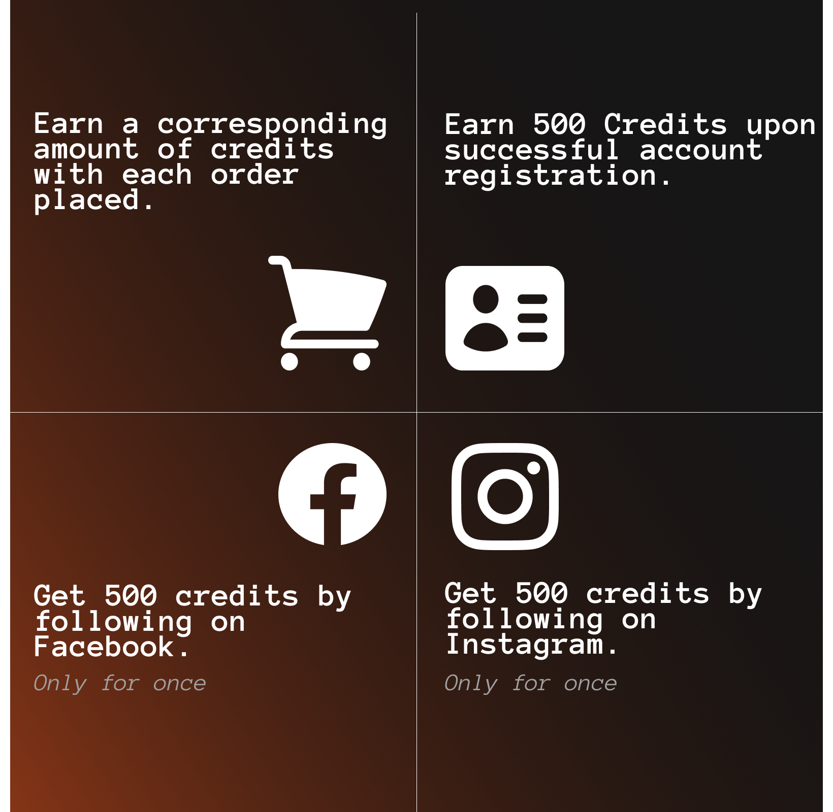 You can earn credits through purchases, account registration, referring friends, following our social media, and participating in special events. Different actions award different credit amounts.