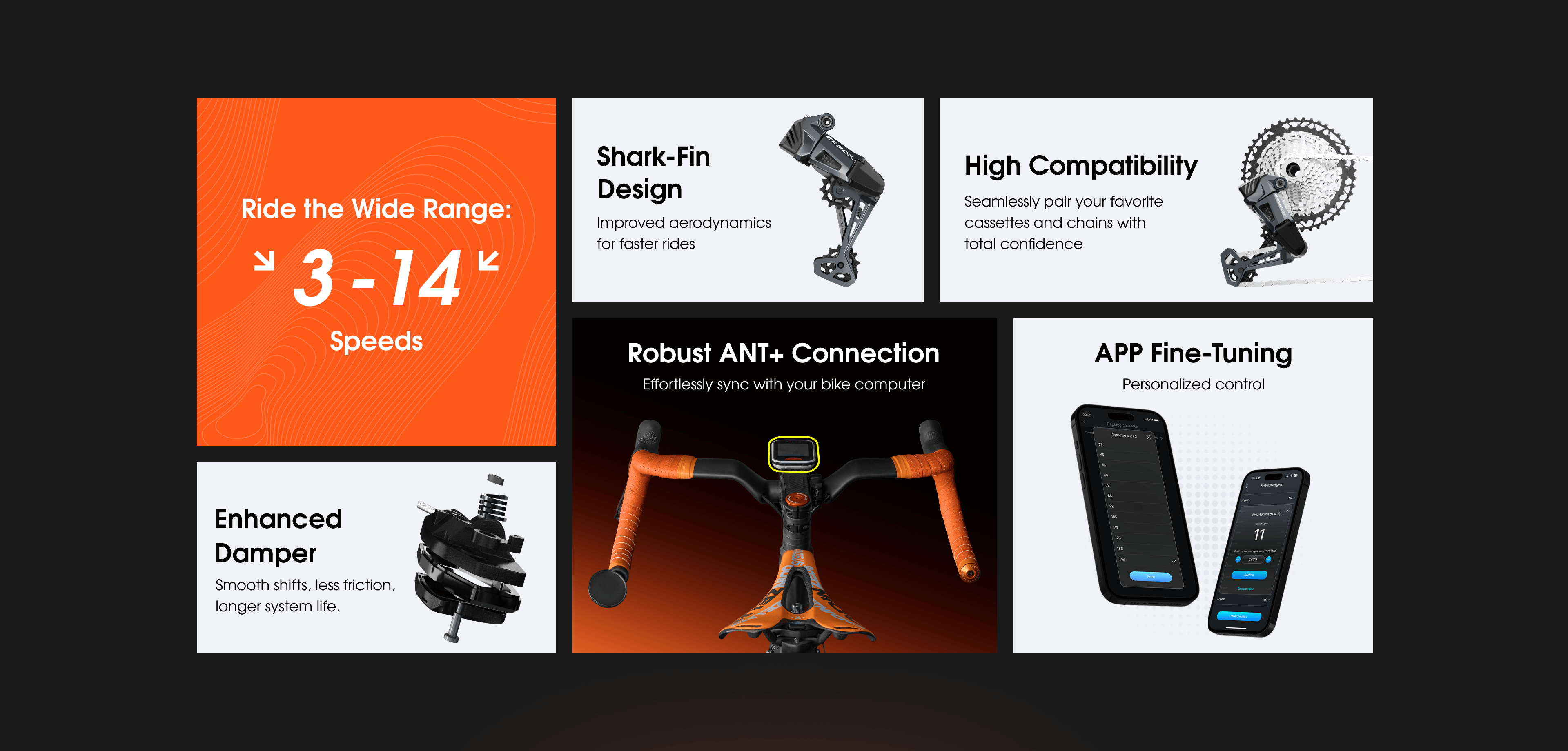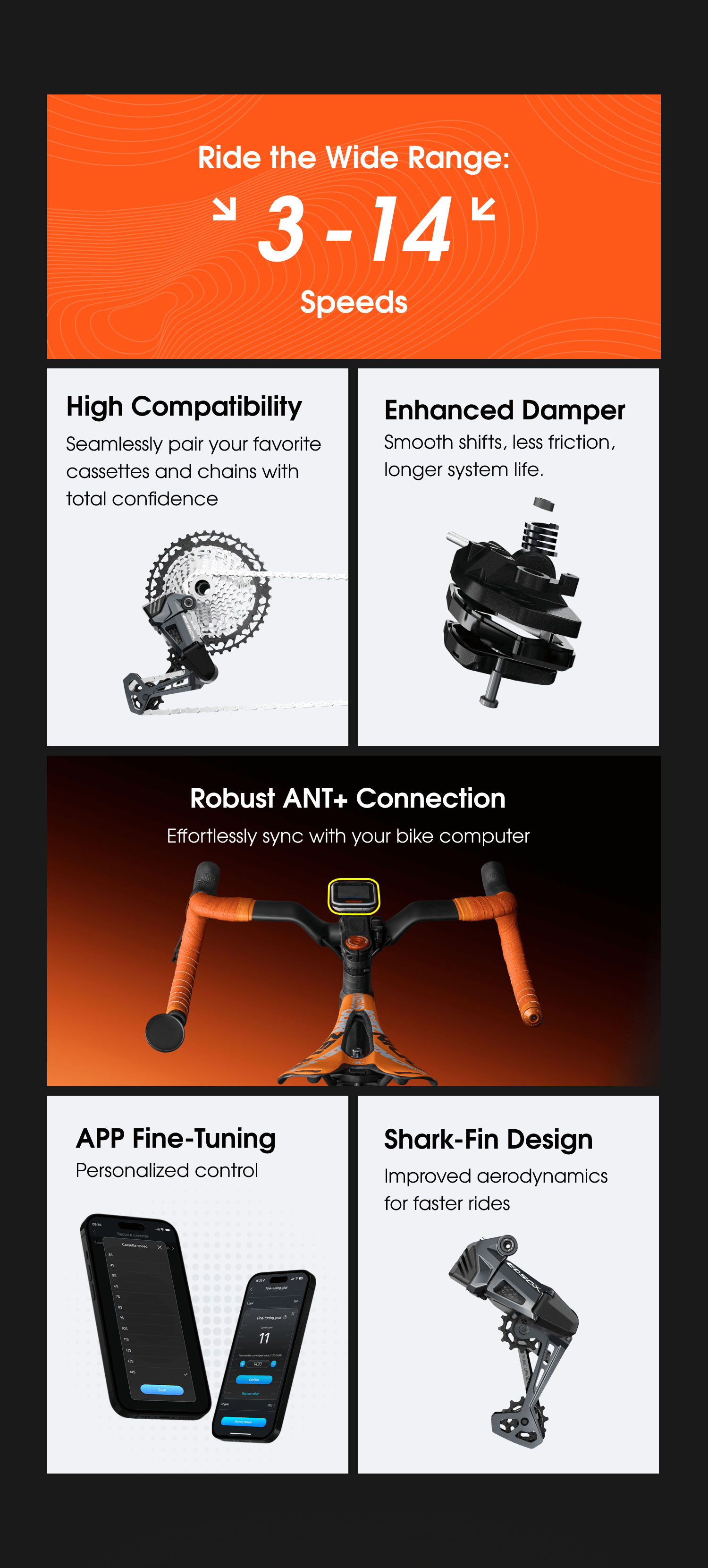 - Shift mode - front and rear dial cassette number switching, hand shift customized buttons, front and rear dial fine tuning