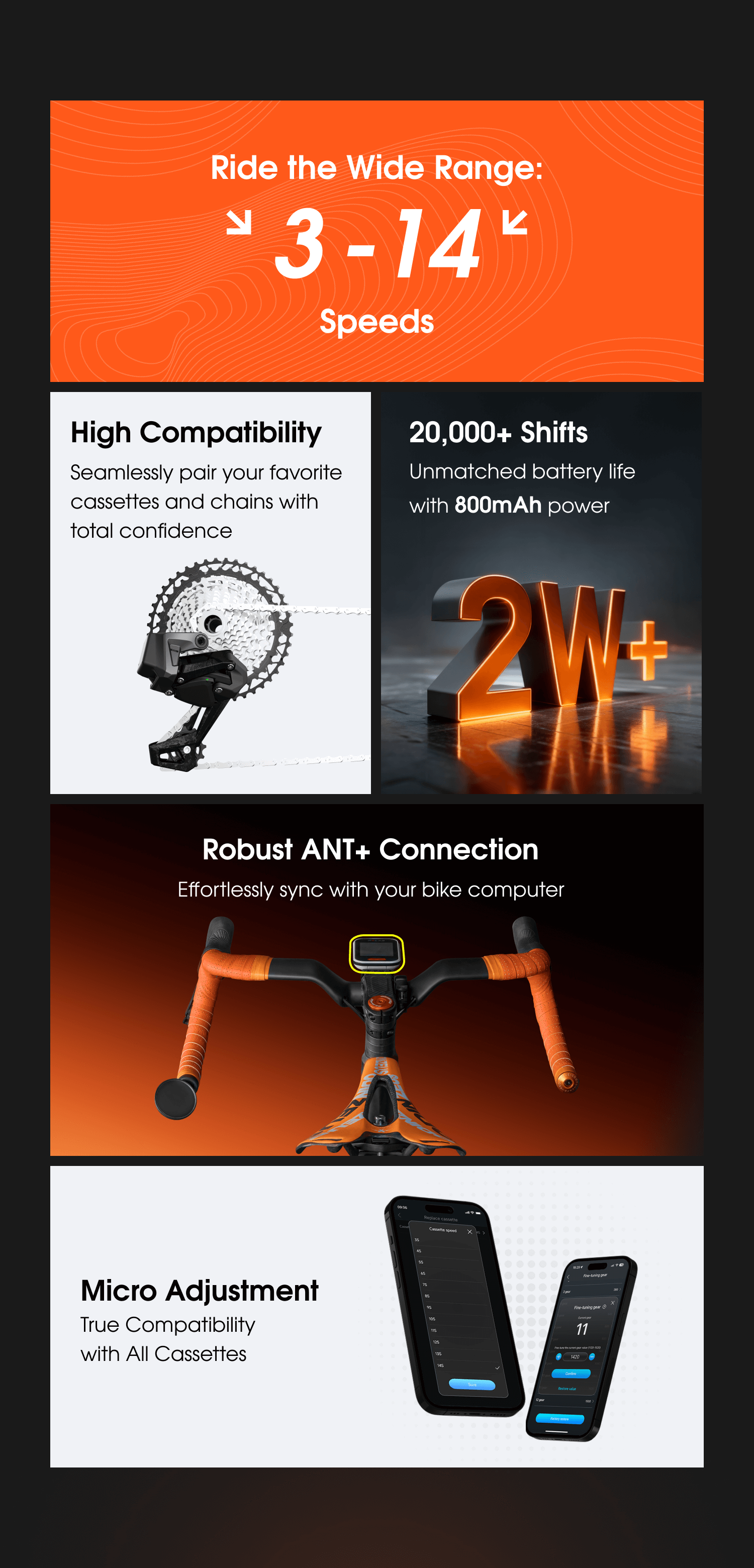 "Wheeltop Wireless EDS TX 3-14 Speed Groupset: “Compared to a mechanical derailleur, the Wheeltop Electronic Derailleur allows you to switch speeds easily.” The system provides compatibility for any cassette, from 3 speed to 14 speed. All of this is accomplished inside the Wheeltop App."
