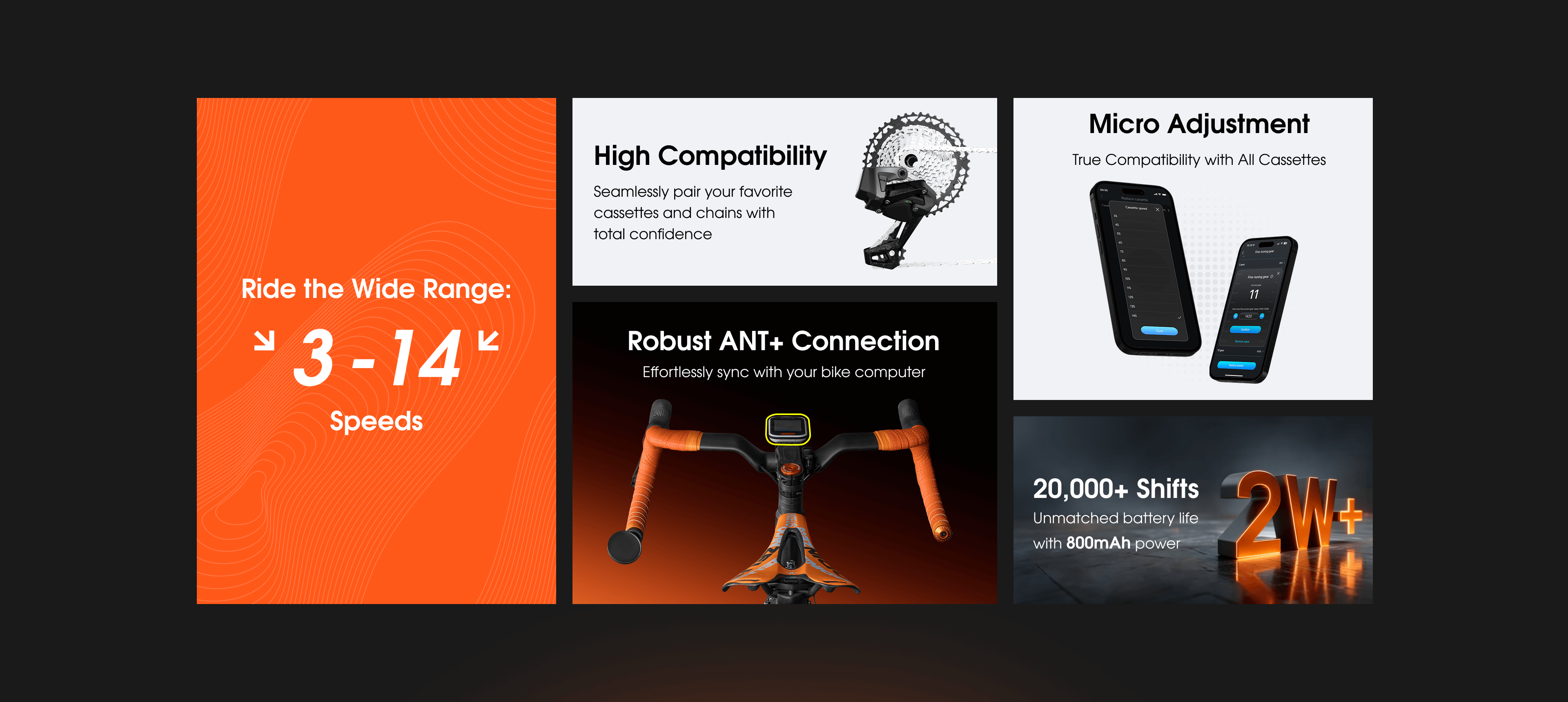 - Shift mode - front and rear dial cassette number switching, hand shift customized buttons, front and rear dial fine tuning